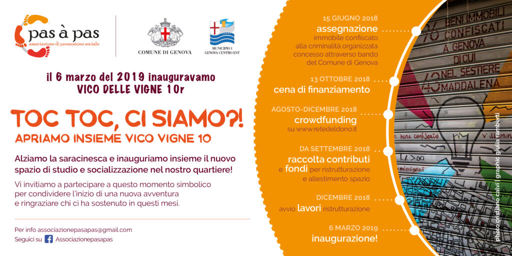 Nel 2018 riceviamo in assegnazione dal Comune di Genova, tramite bando, l’immobile sito in Vico delle Vigne 10r, una delle prime confische della famiglia Canfarotta. Dal 2019 siamo un presidio di legalità nel centro storico di Genova. Da allora, con costanza e cura e nella sua nemesi – da luogo di sfruttamento a luogo di accoglienza – lo teniamo aperto con le nostre attività scolastiche e di interculturalità. «Un bene confiscato v’illuminerà» come recita la nostra saracinesca – su cui gli Scout hanno sapientemente dipinto la mappa delle prime confische – perché i luoghi sono connessi alle persone, ai significati di appartenenza e di speranza. Il riutilizzo sociale dei beni confiscati è una responsabilità. Visitabile su appuntamento, oppure nei tour dedicati ai giovani e condotti da Libera Liguria.
